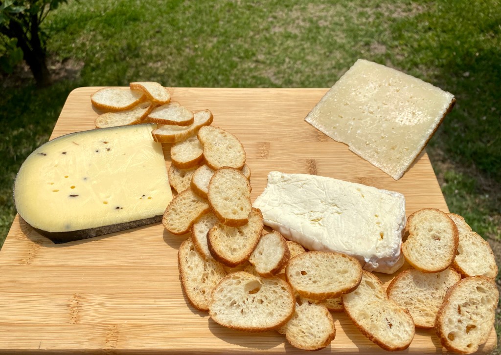 Start by positioning your cheeses first. This will help give you an idea of how you want your board to look. It’s also very important to place items that go together well, close to each other. Cut a few pieces of cheese to encourage your guests to eat! After the cheese, place your toasts or bread, as this also takes up a lot of space.